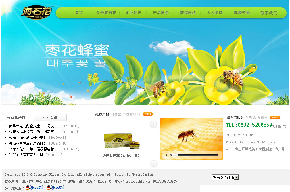 (韓國(guó)獨(dú)資)棗莊市海石花蜂業(yè)有限公司 海石花蜂業(yè)有限公司始創(chuàng)于1982年7月,座落在舉世聞名的冠世榴園腹地,這里群山起伏,榴花似火,蜜蜂翩翩飛舞,風(fēng)景秀麗。 海石花蜂業(yè)是一家集養(yǎng)蜂、蜂產(chǎn)品深加工科貿(mào)為一體化的出口型企業(yè),產(chǎn)品出口日本、韓國(guó)、加拿大等諸多國(guó)家。公司現(xiàn)有四大養(yǎng)蜂基地:中國(guó)冠世榴園生態(tài)養(yǎng)蜂基地、云南西雙版納生態(tài)養(yǎng)蜂基地、黃山藥谷養(yǎng)蜂基地、山海關(guān)范家鎮(zhèn)有機(jī)蜂產(chǎn)品基地.充足的蜜源保證了產(chǎn)品更純、更鮮的特點(diǎn)。海石花企業(yè)擁有多項(xiàng)行業(yè)領(lǐng)先的技術(shù),所有產(chǎn)品均通過(guò)HACCP食品安全管理體系認(rèn)證、綠色食品認(rèn)證、有機(jī)食品認(rèn)證等. 公司總經(jīng)理周長(zhǎng)信曾先后兩次在人民大會(huì)堂受到國(guó)家總理溫家寶、國(guó)家副總理回良玉的親切接見(jiàn),被譽(yù)為中國(guó)養(yǎng)蜂狀元.現(xiàn)任中國(guó)蜂協(xié)理事,市政協(xié)常委委員. 由著名導(dǎo)演張惠中執(zhí)導(dǎo),張繼編劇的電視連續(xù)劇《石榴花開(kāi)》中海石花蜂業(yè)系列蜂產(chǎn)品有多次不同角度的呈現(xiàn),《石榴花開(kāi)》的許多劇情都是在海石花公司、海石花養(yǎng)蜂基地拍攝的,首播已在陜西綜藝臺(tái)等地方電視臺(tái)陸續(xù)開(kāi)播,隨后各地方衛(wèi)視都將全面播出。 公司不斷發(fā)展壯大,形成了集海石花蜂業(yè)養(yǎng)蜂基地、海石花蜂業(yè)生產(chǎn)基地為一體的現(xiàn)代化、規(guī)模化的出口型企業(yè),成為國(guó)內(nèi)同行業(yè)中的佼佼者。 海石花蜂業(yè)有限公司技術(shù)力量雄厚,產(chǎn)品已發(fā)展為六大系列、100多個(gè)單品,產(chǎn)品出口日本、韓國(guó)、加拿大等諸多國(guó)家。 棗莊網(wǎng)站制作 |