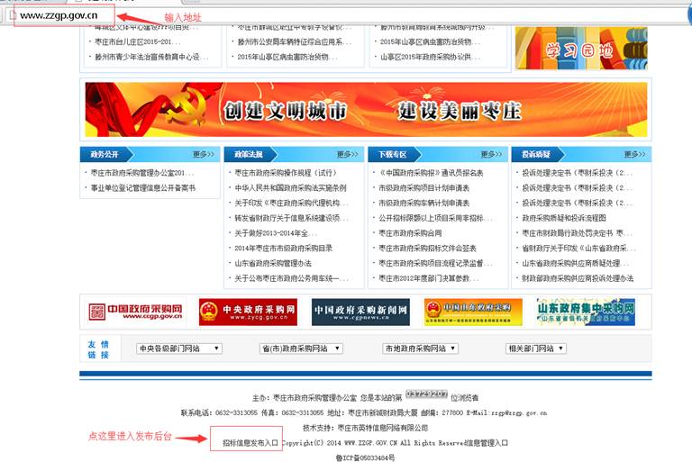 1、 登陸棗莊市政府采購網地址:http://www.zzgp.gov.cn/ 拉到網頁下邊: